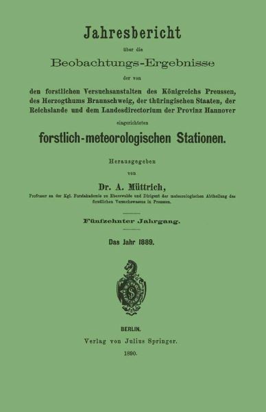 A. Vorbemerkungen.- B. Resultate der während des Jahres 1889 angestellten Beobachtungen.- 1. Luftdruck, Tafel I bis Tafel III.- 2. Lufttemperatur, Tafel IV bis Tafel IX.- 3. Erdbodentemperaturen, Tafel X bis Tafel XIV.- 4. Atmosphärische Feuchtigkeit, Tafel XV bis Tafel XVII.- 5. u. 6. Verdunstungsgrösse einer freien Wasserfläche und Niederschläge, Tafel XVIII bis Tafel XXII.- 7. Bewölkung, Tafel XXIII bis Tafel XXV.- 8. Winde, Tafel XXVI.- 9. Frost- und Schneegrenzen, sowie Anzahl der Eistage, Frosttage und Sommertage, Tafel XXVII und Tafel XXVIII.- C Zweistündliche Werthe der Lufttemperatur zu Eberswalde beobachtet an Registrirthermometern von Richard Frères, Tafel XXIX.- D. Anhang.- 1. Verzeichniss der eingegangenen Geschenke.- 2. Verzeichniss der Behörden etc., an welche die monatlich erscheinenden Beobachtungs-Ergebnisse yersandt sind.- 3. Verzeichniss der Behörden etc., an welche der Jahresbericht pro 1888 versandt ist.