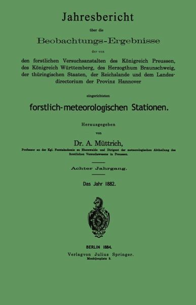 der von den forstlichen Versuchsanstalten des Königreich Preussen, des Königreich Württemberg, des Herzogthum Braunschweig, der thüringischen Staaten, der Reichslande und dem Landes-directorium der Provinz Hannover eingerichteten forstlich-meteorologischen Stationen. Achter Jahrgang