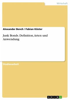 Studienarbeit aus dem Jahr 2011 im Fachbereich BWL - Investition und Finanzierung, Note: 2,3, EBC Hochschule Hamburg, Sprache: Deutsch, Abstract: Inhaltsverzeichnis 1. DEFINITION JUNK BONDS 3 2. DAS EXTERNE RATING IN DER WIRTSCHAFT 4 3. ARTEN VON JUNK BONDS 5 4. DIE ANWENDUNG UND DAS AUFTRETEN VON JUNK BONDS AN DEN KAPITALMÄRKTEN 6 LITERATURVERZEICHNIS 7