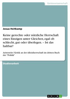 Studienarbeit aus dem Jahr 2024 im Fachbereich Philosophie - Sonstiges, Note: 2,0, Universität Erfurt (Philosophische Fakultät), Veranstaltung: Aristoteles, Politik, Sprache: Deutsch, Abstract: Die vorliegende Arbeit untersucht das siebzehnten Kapitel des dritten Buches der "Politik" des Aristoteles auf einen Widerspruch oder eine Ungenauigkeit. In dem genannten Kapitel beschäftigt sich Aristoteles mit der Zuordnung nach Geeignetheit der drei Herrschaftsformen: Königsherrschaft, Aristokratie und Politie zu einer jeweils passenden Art von Bevölkerung. Dabei heißt es, dass eine Alleinherrschaft nie gerecht sei, selbst die des einzigen Überlegenen über alle anderen nicht. Ist diese Aussage in Gegenüberstellung mit anderen Passagen der Politik und unter philosophischen Aspekten haltbar?