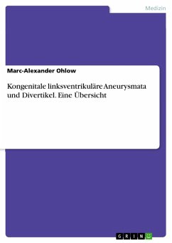Fachbuch aus dem Jahr 2015 im Fachbereich Medizin - Innere Medizin, Note: na, , Sprache: Deutsch, Abstract: Kongenital linksventrikuläre Aneurysmata (LVA) und Divertikel (LVD) sind seltene Diagnosen mit 809 publizierten Fällen seit der Erstbeschreibung 1816. Die Übersicht behandelt den historischen Hintergrund, embryologische Fehlentwicklungen, klinische Präsentation, Wertigkeit diagnostischer Maßnahmen sowie Therapie und Prognose. Hinzu kommt ein ausführliches Literturverzeichnis. Die Ätiologie kongenitaler linksventrikulärer Aneurysmata und Divertikel wird kontrovers diskutiert. Grundsätzlich sind kardiale Fehlbildungen das Resultat komplexer Interaktionen zwischen multifaktoriellen genetischen Anlagen und Umwelteinflüssen, in den meisten Fällen kann kein ursächlicher Faktor identifiziert werden. Die Entwicklung der linksventrikulären Divertikel beginnt in der 4. embryonalen Woche (4-Somitenstadium). Zu diesem Zeitpunkt entstehen während der normalen embryonalen Entwicklung des linken Ventrikels entlang des ventralen Randes des Herzschlauches in der Ventrikelanlage Divertikel, welche in die so genannte Herzgallerte eindringen und später auf Kosten des Myoepikards wachsen. Sie vergrößern das Volumen der linken Herzkammer und geben damit dem primitiven Ventrikel des Embryos das typische trabekuläre Aussehen.
