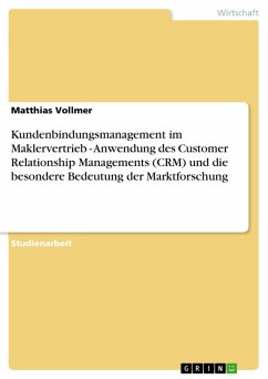 Studienarbeit aus dem Jahr 2006 im Fachbereich BWL - Marktforschung, Note: 2,3, Deutsche Versicherungsakademie GmbH, Veranstaltung: Studium zum Versicherungsbetriebswirt, Sprache: Deutsch, Abstract: Ziel der Arbeit Diese Arbeit hat die Zielsetzung, dem deutschen Versicherungsmakler konkrete Ansätze zur Umsetzung seines Kundenbeziehungsmanagements aufzuzeigen. Darüber hinaus werden ihm die Bedeutung sowie Einführungsmethoden der Marktforschung zur erforderlichen Gewinnung originärer Kundeninformationen zur Erkennung und Nutzung von Akquisitionspotential dargelegt und erläutert. Durch die kombinierte Umsetzung beider Aktivitäten entsteht ein geschlossener Kreislauf, der einen entscheidenden Mehrwert für sein Maklerhaus zur erfolgreichen Kundengewinnung und Bindung profitabler Kunden darstellt. Gang der Untersuchung Im Verlauf dieser Abschlussarbeit wird zunächst die Problemstellung in Kapitel 1 erläutert. Es folgen eine kurze Charakterisierung der Umweltbedingungen eines deutschen Versicherungsmaklers und eine Darstellung der Möglichkeiten zur Einführung eines Kundenbeziehungsmanagements in Kapitel 2. Die Umsetzungsmöglichkeiten und die Erfordernis der Marktforschung als komplementärer Bestandteil des Kundenbeziehungsmanagements werden in den Kapiteln 3 und 4 erläutert. Eine abschließende Betrachtung der Thematik erfolgt in Kapitel 5. [...]