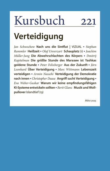 Das Kursbuch 221 über Verteidigung nimmt vieles in Angriff. Zunächst die militärische Verteidigung. Kriegsminister gibt es nicht mehr. Christopher Daase analysiert die differenzierte Verschränkung von Angriff und Verteidigung, Jörn Leonhard liefert eine historische Genese des Verteidigungskrieges. Einen anderen Verteidigungskampf rekonstruiert Joachim Müller-Jung, nämlich die Immunabwehr - eine schöne Beschreibung dafür, dass Verteidigung/Abwehr nichts Passives, nichts Defensives im engeren Sinne sind, sondern eine Art prospektiver Antizipation von Angriffen, die von früheren Angriffen gelernt hat - individuell und evolutionär. Armin Nassehis Beitrag beschäftigt sich mit den Sicherungssystemen von Demokratien, die auch gegen Angriffe von innen standhalten müssen. Im Gespräch mit Sibylle Anderl entwickelt der Psychologe Marc Wittmann eine Verteidigungsperspektive zwischen existentieller Langeweile und Hektik - es geht um eine Form der Selbstverteidigung im engeren Sinne. Vor empfindungsfähigen KI-System schließlich warnt Eva Weber Guskar. Eine besondere Perspektive entwickelt die Langstrecke von Stefan Rammler. Er beschäftigt sich mit der resilienten Stadt, die sich gegen den Klimawandel verteidigt, will aber zugleich die gegenwärtigen Untergangsnarrative überwinden. Und entwickelt eine Klimafuturologie, und eine utopische Klimazeitreiseliteratur. Voluminös sind die alpinen Schutzeinrichtungen, die Olaf Unverzart in seiner neuen Schauplatz-Kolumne ins Bild gesetzt hat. Berit Glanz' Islandtief, das dreizehnte, beschreibt unter anderem den Vorteil und die Freiheitsgrade der Peripherie, und Jan Schwochow, dessen Kolumne ab jetzt VIZUAL heißt, konfrontiert uns mit Darstellungsformen der Veränderung des Meeresspiegels. Eine außergewöhnliche Art, mit Infografiken Entwicklungen abzubilden und einzuordnen. Peter Felixberger rezensiert schließlich ein wichtiges Sachbuch aus dem Jahr 2044.