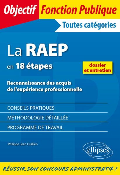Dans le cadre des concours et des examens professionnels, la reconnaissance des acquis de l'expérience professionnelle consiste dans un nouveau type d'épreuve qui vise une sélection des candidats moins centrée sur les connaissances académiques, mais davantage sur les compétences et aptitudes acquises tout au long de leur parcours professionnel. Pour réussir cette épreuve, il est indispensable de la préparer. Le dossier de RAEP demande en effet un important travail de collecte de documents, de recherches dans la littérature consacrée à la gestion des ressources humaines, de vérifications de données personnelles, de réflexion sur son parcours professionnel et enfin de rédaction. L'oral de RAEP demande également un entraînement spécifique en même temps qu'un important travail d'acquisition, de révision et d'actualisation des connaissances administratives. Pour favoriser la mise en place d'un véritable programme de travail, cet ouvrage vous propose : . une préparation du dossier en 10 étapes ; . une préparation de l'oral en 5 étapes, les trois dernières étapes étant consacrées au déroulement de cet oral.