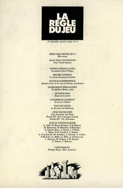Contributions : Mario Vargas Llosa, Michel Onfray, Witold Gombrowicz, Dominique Fernandez, Octavio Paz, Vaclav Havel. Dossiers : Avec Danilo Kis, Sur la nationalisme.