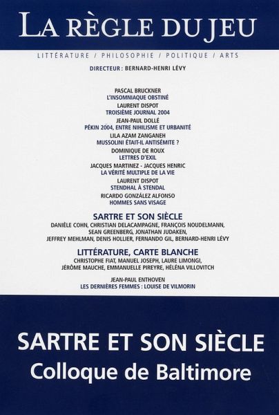 Sommaire n° 27 de la REGLE DU JEU, janvier 2005 Un numéro, cette fois, majoritairement littéraire : -Un dossier « Sartre et son siècle », réunira les communications du colloque tenu récemment à l'université américaine John Hopkins par les plus éminents sartriens français et américains, dont Rybalka, Hollier, BHL (« Les trois Sartre), plus un inédit de Benny Lévy, qui fut le dernier secrétaire de Sartre, « La Cérémonie de la naissance » . -Second dossier : Sept jeunes romanciers publiés chez POL, Léo Scheer, l'Olivier, Maurice Nadeau : Christophe Fiat, Manuel Joseph, Hélèna Villovitch, Laure Limongi, Emmanuelle Pireyre, Jérôme Mauche, Jean-Charles Massera donnent leur vision de la post-littérature et de leurs influences. -Dix « Lettres d'Exil » de Dominique de Roux, vingt ans après sa mort, écrites à sa femme et sa maîtresse, depuis la Suisse et le Portugal, où il est question d'amour, de politique et de littérature. -Deux textes en vis-à-vis : Pascal Bruckner : Sur l'insomnie ; Jim Harrison : Métaphysique du Jet-lag. -Jean-Paul Dollé : Pékin, Chose urbaine. -Entretien avec Jacques Henric : la vérité multiple de la vie et du roman. -Lila Azam Zanganeh : Mussolini éditeur d'Hitler -Jean-Paul Enthoven : Les dernières femmes (3) : Louise de Vilmorin