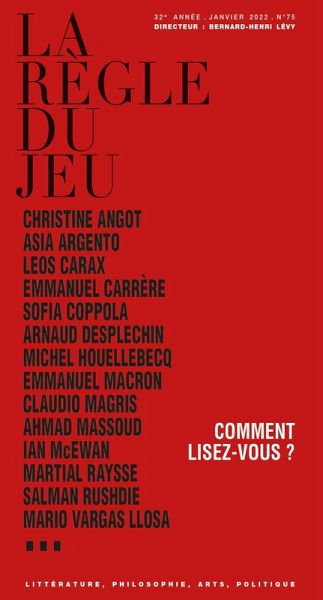 Comment trouve-t-on le temps de lire quand on est écrivain, journaliste, artiste, professeur, cinéaste ou président de la République ? Et comment ce temps peut-il orienter le cours d'une existence ? Quelles sont les lectures marquantes ou manquées, fertiles ou honteuses de Michel Houellebecq ou de Leos Carax, d'Arnaud Despleschin ou d'Emmanuel Carrere, de Martial Raysse ou de Mario Vargas Llosa, de Salman Rushdie ou d'Ahmad Massoud, du Général Sirwan Barzani, de Valérie Pécresse, d'Anne Hidalgo, de Yann Moix, Frédéric Beigbeder, Christine Angot ou Claudio Magris? Toutes ces questions ne font qu'en décliner une, aussi vieille que l'histoire, et qui se réinvente pourtant à chaque génération : « Comment lisez-vous ? » C'est cette question que La Règle du Jeu, à l'occasion de ses 30 ans, a posée à des lecteurs divers et impulsifs, frénétiques et hantés par leurs bibliothèques. Au total, 177 réponses - légères ou graves, fantaisistes ou profondes, inattendues et, parfois, très intimes. En 1919, les surréalistes demandaient aux écrivains : « Pourquoi écrivez-vous ? ». Un siècle plus tard, c'est la même enquête, sous une autre forme, qui se poursuit. Au total, un portrait chinois de l'époque. Une expérience littéraire et un document. Et, en introduction, un long texte de Bernard-Henri Lévy, directeur de la revue :