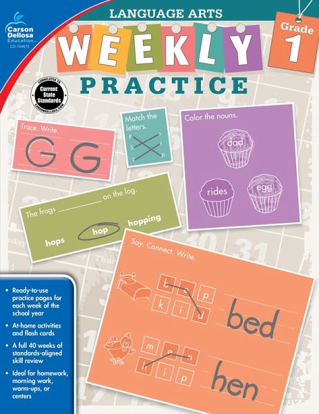Weekly Practice: Language Arts for grade 1 provides daily practice for key concepts such as sight words, beginning sounds, ending sounds, parts of speech, story elements, and more. Complete with flash cards and activities, this series supports classroom success by offering extra practice at home.Improve students' comprehension skills in the classroom while also providing a way to continue the learning process at home. Weekly Practice: Language Arts for grade 1 allows you to reinforce language arts topics at school and at home by offering 40 weeks of standards-based activities and skill review. The unique layout and engaging exercises keep students interested as they build concept knowledge and essential skills. Reproducible at-home activities and flash cards are also included to encourage the home-to-school connection that's essential for student success.Weekly Practice is the perfect time-saving resource for creating standards-aligned homework packets and keeping students' skills sharp all year long. The Weekly Practice series for kindergarten to grade 5 provides 40 weeks of comprehensive skill review. Each 192-page supplemental workbook focuses on critical skills and concepts that meet the standards for language arts or math. Designed to help students achieve subject mastery, each book includes four days of practice activities, weekly off-the-page activities, Common Core State Standards alignment matrix, flash cards, and an answer key. Weekly Practice offers an effortless way to integrate language arts or math practice into daily classroom instruction.