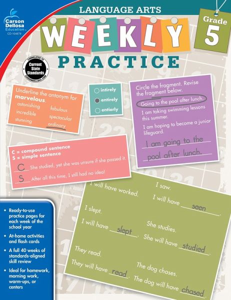 Weekly Practice: Language Arts for grade 5 provides daily practice for key concepts such as spelling, root words, affixes, figurative language, parts of speech, main idea, and more. Complete with flash cards and activities, this series supports classroom success by offering extra practice at home.Improve students' comprehension skills in the classroom while also providing a way to continue the learning process at home. Weekly Practice: Language Arts for grade 5 allows you to reinforce language arts topics at school and at home by offering 40 weeks of standards-based activities and skill review. The unique layout and engaging exercises keep students interested as they build concept knowledge and essential skills. Reproducible at-home activities and flash cards are also included to encourage the home-to-school connection that's essential for student success.Weekly Practice is the perfect time-saving resource for creating standards-aligned homework packets and keeping students' skills sharp all year long. The Weekly Practice series for kindergarten to grade 5 provides 40 weeks of comprehensive skill review. Each 192-page supplemental workbook focuses on critical skills and concepts that meet the standards for language arts or math. Designed to help students achieve subject mastery, each book includes four days of practice activities, weekly off-the-page activities, Common Core State Standards alignment matrix, flash cards, and an answer key. Weekly Practice offers an effortless way to integrate language arts or math practice into daily classroom instruction.