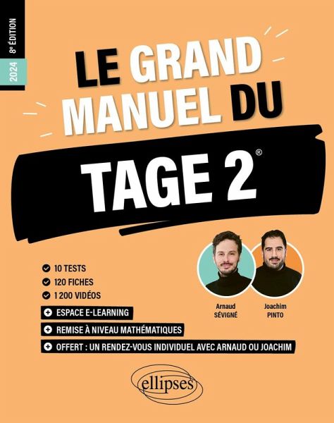 OBJECTIF : Avoir une préparation complète au TAGE 2 pour viser les meilleurs scores. LES NOUVEAUTÉS : - Un rendez-vous individuel offert avec Joachim Pinto & Arnaud Sévigné - 10 nouvelles astuces de calcul. - Une remise à niveau mathématiques mise à jour.
