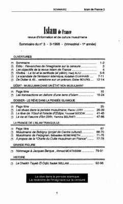 Au sommaire de ce numero 3 :Les scandales de l'mission islamique de France 2 - Les rves de la culture musulmane - Le rve de Yusuf et l'oracle de l'Oedipe sophoclen - La vie et l'oeuvre d'Ibn Srn - Spiritualit : rponse Jean-Paul Charnay - L'lection d'un organe reprsentatif des musulmans de Belgique - Avec l'Islam : affrontement ou dialogue ?