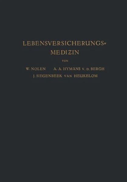 Erstes Kapitel. Einleitung, allgemeine Betrachtungen und Statistik.- Geschichtliche Übersicht.- Zusarnmenstellung von Sterblichkeitstabellen.- Einflüsse allgemeiner Art auf die Lebensdauer.- Sterblichkeit unter Versicherten.- Zweites Kapitel. Faktoren des Widerstandsvermögens.- Konstitution - Erblichkeit.- Erblichkeit (Siegenbeek van Heukelom).- Drittes Kapitel. Lebensweise und Gewohnheiten.- Alkoholismus.- Rauchen.- Morphinismus.- Cocainismus.- Vegetarismus.- Viertes Kapitel. Die ärztliche Untersuchung.- Die Anamnese (Siegenbeek van Hetjkelom).- Fünftes Kapitel. Die ärztliche Untersuchung (Fortsetzung)..- Status praesens (Nolen).- Brust und Brustorgane (Nolen).- Puls (Hymans van den Bergh).- Untersuchung des Bauches und der Bauchorgane (Nolen).- Untersuchung des Nervensystems (Nolen).- Untersuchung des Urins (Hymans van den Bergh).- Untersuchung des Urins (Fortsetzung).- Untersuchung auf Zucker.- Untersuchung des Urins (Fortsetzung).- Untersuchung des Urinsediments.- Sechstes Kapitel. Zusammenhänge zwischen Körpermaßen und -gewieht und der Lebensdauer.- Körperlänge und Lebensdauer.- Körpergewicht und Körperlänge.- Körpergewicht im Zusammenhang mit Körperlänge und Lebenszeit.- Körpergewicht und Beruf.- Körpergewicht und Lebensdauer.- Magerkeit.- Brustmaße.- Bauchumfang.- Körpergewicht und Todesursachen.- Siebentes Kapitel. Einige Krankheiten von besonderer Bedeutung für die Lebensversicherung..- Tuberkulose (Siegenbeek van Hettkelom).- Asthma nervosum. Catarrhe sec. Emphysem (Tuberkulose) (Nolen).- Herzkrankheiten (Nolen).- Erkrankungen der Bauchorgane (Hymans van den Bergh).- Krankheiten der Schilddrüse (Hymans van den Bergh).- Gicht (Hymans van den Bergh).- Fettsucht (Siegenbeek van Heukelom).- Syphilis (Hymans van den Bergh).- Arteriosklerose(Hymans van den Bergh).- Venektasien, Hamorrhoiden, Varicen, Phlebitis (Nolen).- Anämie (Nolen).- Otitis media (Siegenbeek van Heukelom).- Schwangerschaft (Siegenbeek van Heukelom).- Albuminuric (Hymans van den Bergh).- Glykosurie (Hymans van den Bekgh).- Achtes Kapitel. Versieherung unterwertigen Lebens.- Versiclierung unterwertigen Lebens.- Neuntes Kapitel. Speziaiistisehe Untersuchung. - Das Gutaehtenforamlar. - Verzeichnis der Todesursachen. - Bas Berufsgehemnis.- Spezialistisehe Untersuchung.- Gutaehtenformular.- Verzeichnis der Todesursachen.- Das Berufsgeheimnis gegenüber der Lebensversicherung.- Namenverzeichnis.