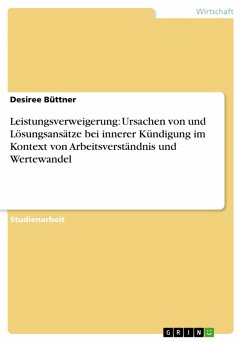 Studienarbeit aus dem Jahr 2006 im Fachbereich Führung und Personal - Sonstiges, Note: 2,7, Hochschule Harz Hochschule für angewandte Wissenschaften, Sprache: Deutsch, Abstract: Verweigert ein Arbeitnehmer das Erbringen der Arbeitsleistung, liegt eine Vertragspflichtverletzung vor. Ist der Arbeitgeber hierdurch geschädigt kann dieses für den Arbeitnehmer Konsequenzen in Form von Haftung und oder einer Kündigung haben. Wird die Leistungsverweigerung nicht aus rein rechtlicher Sicht betrachtet, erweist sich diese als sehr komplex. In dieser Hausarbeit wird im ersten Teil ein kurzer Überblick über die aus dem Arbeitsvertrag resultierenden Pflichten eines Arbeitnehmers gegeben und auf die Konsequenzen bei einer Pflichtverletzung eingegangen. Der zweite Teil beschäftigt sich mit der Motivation von Menschen im Arbeitsleben, dem Verständnis von Arbeit im Wandel der Zeit und Arbeitszufriedenheit. Im dritten Teil werden Ursachen der inneren Kündigung und mögliche Lösungsansätze diskutiert. Insgesamt gibt diese Arbeit einen Überblick über die bestehenden Erkenntnisse des menschlichen Handelns in Bezug auf Arbeit und versucht, diese Erkenntnisse in den Lösungsansätzen bei innerer Kündigung anzuwenden.