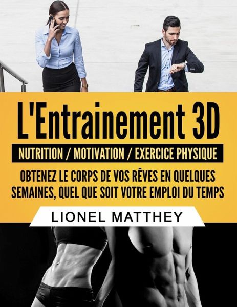 Découvrez l'Entrainement3D au travers du parcours passionnant de son auteur : de ses premiers régimes alors qu'il n'était qu'un petit garçon obèse de 5 ans, jusqu'à son emploi de cadre dynamique à l'agenda surchargé mais au corps parfaitement sculpté. Que vous soyez une mère au foyer jonglant avec les tâches ménagères et sa famille, un manager travaillant plus de dix heures par jour ou simplement que vous ayez décidé de perdre rapidement quelques kilos avant les vacances, cette méthode permettant d'atteindre le corps de vos rêves en quelques semaines vous surprendra ! Vous y trouverez les trois dimensions spécialement conçues pour atteindre vos objectifs, même si votre emploi du temps ne laisse pas de place pour le fitness ou les régimes : La Nutrition Optimale, le Mental d'Acier et l'Express Training. Mais plutôt que de vous donner une liste de consignes théorique à appliquer, l'auteur partagera avec vous les épreuves qu'il a rencontrées durant sa vie et durant celle des personnes qu'il a suivies et aidées. Il vous guidera à chaque étape en vous expliquant comment agir au quotidien pour obtenir le corps dont vous avez toujours rêvé, tout en évitant les pièges et obstacles typiques que vous allez rencontrer. Vous découvrirez alors qu'obtenir le corps de vos rêves n'est pas uniquement un travail physique, mais également mental ! Vous vous sentez impuissant devant les kilos en trop ? Vous êtes frustré de ne pas trouver le temps et la motivation pour reprendre votre physique en main ? Alors l'Entrainement 3D va vous permettre d'atteindre vos objectifs les plus ambitieux en un rien de temps ! L'auteur tient également à s'engager contre l'obésité de manière globale, c'est pour cela que 2% des bénéfices liés à la vente de l'Entrainement 3D son reversés à la ligue contre l'obésité.