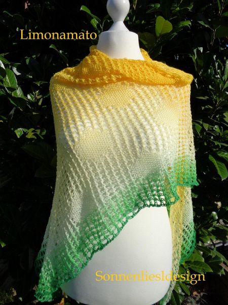 Limonamato bedeutet in etwa "geliebte Zitrone", frei aus dem Italienischen, was zu diesem Stricktuch wunderbar passt. Wer dieses Dreieckstuch strickt, sollte sich nicht wundern, wenn er sich nach mediterranem Klima und dem Duft von Zitronen sehnt. In das luftig leichte Muster reihen sich Zitronen, die an der unteren Kante eher der Farbe von Limetten entsprechen. Aber wie viele Sorten an Zitrusfrüchten gibt es eigentlich wirklich? Und wer sagt, dass man aus Zitronen nicht Orangen und Mandarinen zaubern kann? Letztendlich liegt es nur an der Farbe und dem Traum von Zitronen- und Orangenhainen mit ihrem unübertrefflichen Aroma, für welche Frucht in diesem Tuch Sie sich entscheiden ... Die Strickanleitung "Limonamato" ist für Strickanfänger geeignet, die mit linken, rechten und zusammengestrickten Maschen sowie Umschlägen etwas umgehen können. Sie ist Reihe für Reihe in Worten und Buchstabenkürzeln erklärt. Das Muster kann beliebig erweitert oder verkürzt werden. EXTRA: Die Anleitung enthält auch einen Vorschlag für eine Stola! Material: 1000 m "Zitronenhain" von MaggieP - Wolltraeume, www.maggiep-wolltraeume.at, 4-fach gewickelt, proportional mehr Gelb, Stricknadel 3,5 mm, eventuell Maschenmarkierer Größe: ca. 270 x 118 cm