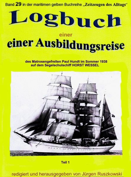 Ein "Logbuch" dokumentierte den Lehrgang eines jungen Matrosengefreiten auf demSegelschulschiff HORST WESSEL vom 1. Juli bis 30. September 1938 - Nach dem Wiederaufbau der deutschen Kriegsflotte der Mitte der 1930er Jahre reichte die "GORCH FOCK" (I) für die Ausbildung seemännischen Nachwuchses nicht mehr aus. Nach den gleichen Plänen, nur mit etwas längerem Rumpf entstand deshalb dieses zweite Segelschulschiff bei Blohm & Voss für die Inspektion des Bildungswesens. Es führte bis Kriegsbeginn mehrere Auslandsreisen durch hier nach Edinburgh und Norwegen. Der letzte Kommandant, Kapitänleutnant Schnibbe, blieb auch nach dem Kriegsende auf dem Schiff und überführte es 1946 als Reparationsleistung in die Vereinigten Staaten. Seither fährt die HORST WESSEL unter dem Namen "EAGLE" (Adler) etwa drei Monate im Jahr unter der Regie der US-Küstenwache und liegt sonst meist im neuen Heimathafen New London. Aus Rezensionen zur maritimen gelben Buchreihe: "Ich bin immer wieder begeistert von der "Gelben Buchreihe". Die Bände reißen einen einfach mit und vermitteln einem das Gefühl, mitten in den Besatzungen der Schiffe zu sein. Inzwischen habe ich ca. 20 Bände erworben und freue mich immer wieder, wenn ein neues Buch erscheint. Danke, Herr Ruszkowski." oder "Die Bände reißen einen einfach mit und vermitteln einem das Gefühl, mitten in den Besatzungen der Schiffe zu sein. Inzwischen habe ich ca. 20 Bände erworben und freue mich immer wieder, wenn ein neues Buch erscheint. oder: Sämtliche von Jürgen Ruszkowski aus Hamburg herausgegebene Bücher sind absolute Highlights der Seefahrts-Literatur. Dieser Band macht da keine Ausnahme. Sehr interessante und abwechselungsreiche Themen aus verschiedenen Zeitepochen, die mich von der ersten bis zur letzten Seite gefesselt haben! Man kann nur staunen, was der Mann in seinem Ruhestand schon veröffentlich hat. Alle Achtung!