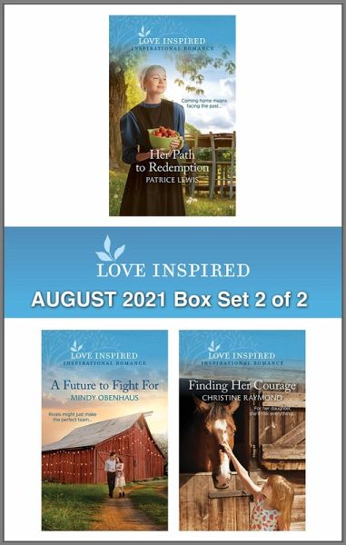 Love Inspired brings you three new titles! Enjoy these uplifting contemporary romances of faith, forgiveness and hope. This box set includes: HER PATH TO REDEMPTION By Patrice Lewis Returning to the Amish community she left during her rumspringa, widowed mother Eliza Struder's determined to redeem the wild reputation of her youth. But one woman stands between her and acceptance into the church-the mother of the man she left behind. Can she convince the community-and Josiah Lapp-to give her a second chance? A FUTURE TO FIGHT FOR (A Bliss, Texas novel) By Mindy Obenhaus Single father Crockett Devereaux and widow Paisley Wainwright can't get through a church-committee meeting without arguing-and now they have to work together to turn a local castle into a museum and wedding venue. But first they must put their differences aside…and realize they make the perfect team. FINDING HER COURAGE By Christine Raymond Inheriting part of a ranch is an answer to prayers for struggling widow Camille Bellamy and her little girl-except Ty Spencer was left the rest of it. They strike a bargain: he'll agree to sell the ranch if she helps plan an event that could keep his business afloat. But can their arrangement stay strictly professional? For more stories filled with love and faith, look for Love Inspired August 2021 Box Set - 1 of 2