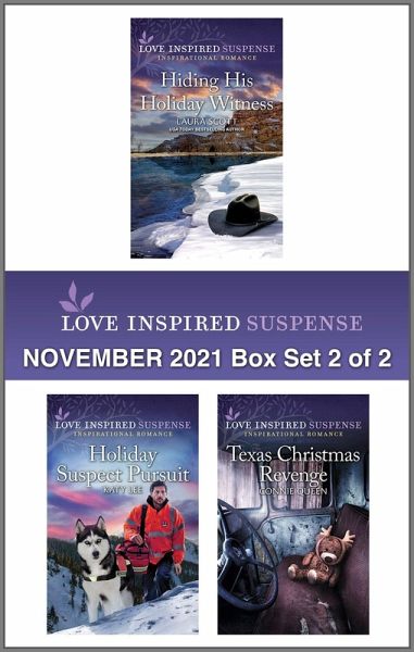 USA TODAY Bestselling Author Laura Scott A frantic call from a witness whose safe house is breached sends US marshal Slade Brooks to Robyn Lowry's side. But when he reaches her, she doesn't remember him-or the crime she witnessed. Now going off the grid until they figure out who leaked her location is the only way to keep her alive… HOLIDAY SUSPECT PURSUIT By Katy Lee After a murderer strikes, deputy Jett Butler and his search-and-rescue dog must work with the sole witness-FBI agent Nicole Harrington. But Nicole's the ex-fiancée he left behind after a car accident gave him amnesia years ago. And unlocking his past might be just as dangerous as facing the killer on their heels… TEXAS CHRISTMAS REVENGE By Connie Queen Emergency dispatcher Brandi Callahan believes her missing sister's dead-until she answers a 911 call from her. When the cryptic call leads Brandi to a little boy just as bullets fly her way, she turns to her ex, Rhett Kincaid. But can the Texas Ranger shield Brandi and the child through Christmas? For more stories filled with danger and romance, look for Love Inspired Suspense November 2021 Box Set - 1 of 2