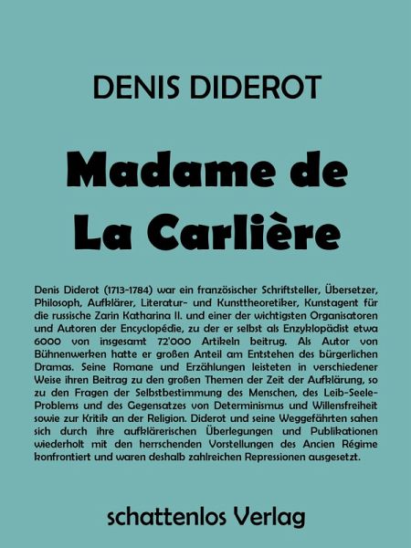 Denis Diderot (1713-1784) war ein französischer Schriftsteller, Übersetzer, Philosoph, Aufklärer, Literatur- und Kunsttheoretiker, Kunstagent für die russische Zarin Katharina II. und einer der wichtigsten Organisatoren und Autoren der Encyclopédie, zu der er selbst als Enzyklopädist etwa 6000 von insgesamt 72'000 Artikeln beitrug. Als Autor von Bühnenwerken hatte er großen Anteil am Entstehen des bürgerlichen Dramas. Seine Romane und Erzählungen leisteten in verschiedener Weise ihren Beitrag zu den großen Themen der Zeit der Aufklärung, so zu den Fragen der Selbstbestimmung des Menschen, des Leib-Seele-Problems und des Gegensatzes von Determinismus und Willensfreiheit sowie zur Kritik an der Religion. Diderot und seine Weggefährten sahen sich durch ihre aufklärerischen Überlegungen und Publikationen wiederholt mit den herrschenden Vorstellungen des Ancien Régime konfrontiert und waren deshalb zahlreichen Repressionen ausgesetzt.