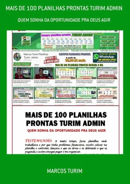 (livro com as descrições e links das planilhas que temos no youtube) TESTEMUNHO: A muito tempo, fazia planilhas onde trabalhava e por que tinha problemas financeiros, resolvi colocar na planilha e controlar, lançava o que eu devia e ia deletando o que ia pagando, e assim consegui pagar e me organizar. Foi o começo de tudo, pra organizar as finanças da minha família e aprender trabalhar com o Excel, graças a Deus, estamos podendo ajudar minha família hoje e pessoas que precisam de planilhas práticas e simples, TURIM ADMIN. Deus abençoe, fica na paz. Eu sou o Marcos Turim, autor das PLANILHAS TURIM ADMIN, peço que conheçam nosso trabalho, nossa página e muitas planilhas de diferentes modelos e segmentos. PLANILHAS PRONTAS PARA USO - Duvidas me chama, To no ZAP - 66-98408-2491, ou peça pelo email: marcosturim12@gmail.com. Conheça nossas planilhas em nosso canal no Youtube - Marcos Turim Planilhas Turim Admin