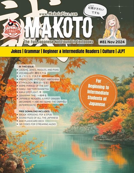 Ah, November! The air is crisp, the days are growing shorter, and the leaves are putting on their most dazzling show of the year. Just look at that cover! Isn't it stunning? Those vivid reds and golden yellows are a celebration of Japan's famous 紅葉 - the autumn leaves that transform the landscape into a fiery canvas. If you look up 紅葉 you'll find two readings: こうよう and もみじ. Now, you might be wondering, why? Well, 紅葉(こうよう) generally refers to the vibrant autumn leaves in a broader sense, while 紅葉(もみじ) specifically highlights the beauty of the Japanese maple tree, with its delicately shaped leaves and brilliant red hue. Both readings, however, capture the spirit of fall in Japan-the season of changing colors, warm nostalgia, and leisurely strolls through nature. People travel far and wide to enjoy 紅葉狩(もみじが)り (autumn-leaf viewing) which literally means "hunting autumn leaves." It's not so much a hunt as it is a chance to admire the beauty of nature, similar to 花見(はなみ) (cherry blossom viewing) and 月見(つきみ) (moon viewing). So, as you read through this month's Makoto, take a moment to soak in that feeling of 紅葉 - whether you picture the iconic もみじ maple leaves or just that full-blown autumn こうよう explosion of colors. Let's dive into this season together! Details: