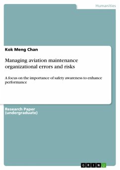 Research Paper (undergraduate) from the year 2011 in the subject Sociology - Work, Education, Organisation, grade: 90%, University of Newcastle, course: Masters Of Aviation Management, language: English, abstract: To manage risks and errors, there must be a good understanding, not just as to what has happened but why did it happen in order to determine the root problems and causes. Using the Reason model (Reason, 1991), investigations into these occurrences are made possible to provide the basis for identifying threats, flawed defense mechanism and conducting unsafe organizational conditionals. It makes sense as a continuum effort to manage aviation maintenance errors and risks to enhance safety and performance in the long term through identifying them and implanting vital defenses. A safety culture can foster these safe activities by creating trust and dialogue between management and individuals within a maintenance repair organization (MRO). The good safety culture aspects are pervasively within the shared attitudes of concern and care in the MRO and involves with the management. Surrounding this open atmosphere, there should have systems that share important data whereby the workforce are encouraged to make reports with trust and fairness. One shared concensus on collecting these data is by implementing of maintenance error management system (MEMS). Implications of active and latent failures and the benefits of maintenance resource training (MRM) are further discussed.