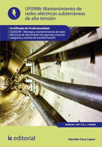 Efectuar el mantenimiento predictivo y preventivo de una instalación de red eléctrica subterránea de alta tensión, a partir de la documentación técnica y siguiendo los procedimientos establecidos, en condiciones de calidad y seguridad. Realizar la reparación de averías en una red subterránea de alta tensión siguiendo los procedimientos establecidos, en condiciones de seguridad y calidad. Elaborar informes y documentación. Ebook ajustado al certificado de profesionalidad de Montaje y mantenimiento de redes eléctricas de alta tensión de 2ª y 3ª categoría y centros de transformación.
