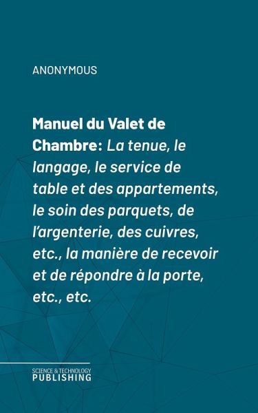 Manuel du Valet de Chambre est un guide complet et détaillé destiné à former et perfectionner les valets de chambre dans l'exercice de leurs fonctions au sein des maisons bourgeoises et aristocratiques du XIXe siècle. Ce manuel, véritable référence de l'art du service domestique, aborde avec précision tous les aspects du métier : la tenue vestimentaire irréprochable, le langage courtois et approprié, ainsi que les règles de politesse et de discrétion indispensables à la profession. Il décrit minutieusement les différentes manières de servir à table, de dresser et de débarrasser, d'entretenir les appartements, de soigner les parquets, l'argenterie, les cuivres et autres objets précieux. L'ouvrage consacre également des chapitres à l'accueil des visiteurs, à la façon correcte de recevoir et de répondre à la porte, à la gestion des messages et à la transmission des ordres. Véritable condensé de savoir-faire, ce manuel offre des conseils pratiques, des astuces et des recommandations pour chaque situation du quotidien, permettant au valet de chambre d'accomplir ses tâches avec efficacité, élégance et discrétion. Il s'adresse aussi bien aux domestiques débutants qu'aux professionnels expérimentés désireux de perfectionner leur art, et constitue un témoignage précieux sur les usages, les codes et les exigences du service domestique à la française à la Belle Époque.