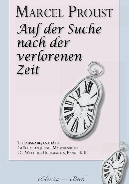 Marcel Proust: Auf der Suche nach der verlorenen Zeit (Originaltitel: >À la recherche du temps perdu<) . Neu editiert, mit aktualisierter Rechtschreibung, voll verlinkt, und mit eBook-Inhaltsverzeichnis . Mit einem aktuellen Vorwort des Herausgebers (Nov/2014) . Enthält den 1919 mit dem wichtigsten französischen Literaturpreis ausgezeichneten zweiten Band >Im Schatten junger Mädchenblüte< (>À l'ombre des jeunes filles en fleurs<) sowie den kompletten dritten Band in der Übersetzung von Walter Benjamin und Franz Hessel. »Markiert den Beginn des modernen Romans im 20. Jahrhundert« Wie auf einem schmalen Grat war er in seinem Leben dahin gewandert: Auf der einen Seite ein bequemes Luxusleben, Urlaub in mondänen Badeorten, Frauen-(und Männer-)geschichten - auf der anderen Seite die Aussicht auf Ruhm und Ehre, auf den einen großen Roman, der alles enthält. Der Ich-Erzähler macht sich, stellvertretend für den Autor, auf die Suche nach der verlorenen Zeit, erlebt vergangene Krisen, Liebschaften und Wirrungen wieder, wandert mit ihm auf dem Pfad der Unentschlossenheit - bis er sich endlich zum Schreiben entschließt. Dort endet das Werk. Welch genialer literarischer Kunstkniff. »Prousts >Recherche< (Originaltitel: >À la recherche du temps perdu<) markiert den Beginn des modernen Romans im 20. Jahrhundert«; er ist nicht nur ein Werk, sondern zugleich »eine Theorie des Kunstwerks« (zit. nach: Der große Brockhaus Literatur, 2007). © eClassica, 2014 Inhalt dieser Teilausgabe Marcel Proust schrieb >Auf der Suche nach der verlorenen Zeit< in sieben Bänden zwischen 1908 und 1922. Veröffentlicht wurde der Roman zwischen 1913 und 1927. Für den zweiten Band, >Im Schatten junger Mädchenblüte< erhielt er den Prix Goncourt, den wichtigsten französischen Literaturpreis. Diesen, ebenso wie die beiden Teile des dritten Bandes, >Die Welt der Guermantes<, enthält dieses eBook. Über den Autor: Valentin Louis Georges Eugène Marcel Proust, (1871-1922) kam im noblen Pariser Stadtviertel Auteuil in der Nähe des Bois de Boulogne zur Welt. Nach einem Studium der Rechts- und Literaturwissenschaften und einer kurzen Beschäftigung in der Bibliothek Mazarine in Paris, führte er - durch die Erbschaft der innig geliebten Mutter wohlhabend - zunächst ein Salonleben, das nur von gelegentlichen Reisen unterbrochen wurde. Zwar hatte er bereits zu Schulzeiten literarische Versuche gewagt, doch lange deutete nichts darauf hin, dass er einer der bedeutendsten Schriftsteller des 20.Jahrhunderts werden sollte. Er war nun fast 40 Jahre alt, seine ständige Krankheit, das Asthma, plagte ihn immer mehr. Er dachte an das Danach, und es schien nichts zu bleiben. Oder konnte er etwas Großes, etwas Ewiges schaffen? Endlich entschied er sich für eine Seite, setzte sich in einen verdunkelten, schallisolierten Raum und machte sich auf die Suche nach der verlorenen Zeit. © eClassica, 2014 ---- eClassica - Die Buchreihe, die Klassiker neu belebt.