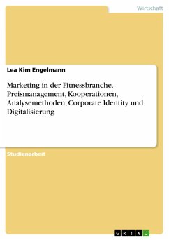 Studienarbeit aus dem Jahr 2016 im Fachbereich BWL - Offline-Marketing und Online-Marketing, Note: 0,9, Deutsche Hochschule für Prävention und Gesundheitsmanagement GmbH, Sprache: Deutsch, Abstract: Diese Hausarbeit thematisiert Marketingstrategien in der Fitnessbranche. Zunächst wird auf das Preismanagement und Kooperationen eingegangen. Hierbei wir die Preiselastizität erklärt und berechnet. Außerdem werden die verschiedenen Methoden der Preisbildung erläutert. Die strategischen Analysemethoden werden mithilfe der klassischen Methoden des Five-Forces-Modell nach Porter und der SWOT-Matrix (Durchführung und Erstellung) erklärt. Die Darstellung der Corporate Identity und ihrer Inhalte erfolgt anhand des Beispiels eines der führenden Unternehmen in der Fitnessbranche. Anschließend werden verschiedene Marktstrategien erläutert. Zum Schluss wird das Thema der Digitalisierung der Fitnessbranche näher beleuchtet. Welche Chancen und Risiken verbergen sich hier? Wie lässt sich die Digitalisierung bisher erkennen? Und wie lässt sich das für ihr eigenes Unternehmen nutzen?