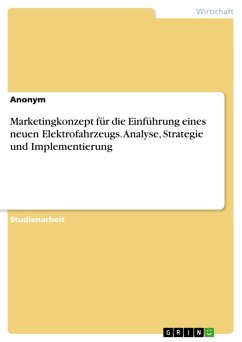 Studienarbeit aus dem Jahr 2019 im Fachbereich BWL - Offline-Marketing und Online-Marketing, Note: 1,0, Hochschule Albstadt-Sigmaringen; Albstadt, Veranstaltung: Marketing, Sprache: Deutsch, Abstract: Dieses Marketingkonzept erarbeitet einen kommunikativen Rahmen für die Einführung des neuen Elektrofahrzeugmodells eMotion der fiktiven drive4motion GmbH. Aufgrund einer durchgeführten Zielgruppenanalyse erstreckt sich die Kommunikation maßgeblich auf den Onlinebereich. In diesem stellen insbesondere die Aspekte der Schaffung von "Awareness" eine zentrale Zielgröße dar. Das Marketing verfolgt als unmittelbares und steuerbares Ziel die Generierung von 15000 Probefahrten im Zeitraum von sechs Monaten ab Launch des Modells. Das indirekte Marketingziel stellen 500 verkaufte Fahrzeuge im gleichen Zeitraum dar.