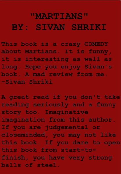 "Martians" uses gross, sometimes graphic humor that will appeal to fans of Mel Brooks, "Airplane!", and Monty Python. This book strives to make a comedy screenplay feel more like a novel, and intends to make readers laugh. This character-driven novel revolves around messed up people geting into trouble and trying to solve their problems.