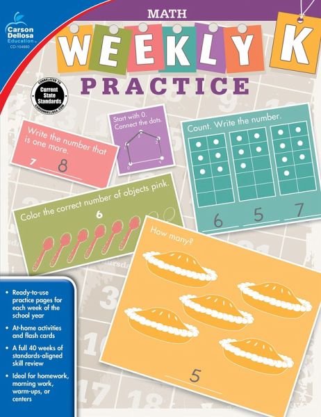 Weekly Practice: Math for kindergarten provides daily practice for key concepts such as counting, shapes, addition, subtraction, positional words, comparing numbers, and more. Complete with flash cards and activities, this series supports classroom success by offering extra practice at home.Improve students' math skills in the classroom while also providing a way to continue the learning process at home. Weekly Practice: Math for kindergarten allows you to reinforce math topics at school and at home by offering 40 weeks of standards-based activities and skill review. The unique layout and engaging exercises keep students interested as they build concept knowledge and essential skills. Reproducible at-home activities and flash cards are also included to encourage the home-to-school connection that's essential for student success.Weekly Practice is the perfect time-saving resource for creating standards-aligned homework packets and keeping students' skills sharp all year long. The Weekly Practice series for kindergarten to grade 5 provides 40 weeks of comprehensive skill review. Each 192-page supplemental workbook focuses on critical skills and concepts that meet the standards for language arts or math. Designed to help students achieve subject mastery, each book includes four days of practice activities, weekly off-the-page activities, Common Core State Standards alignment matrix, flash cards, and an answer key. Weekly Practice offers an effortless way to integrate language arts or math practice into daily classroom instruction.