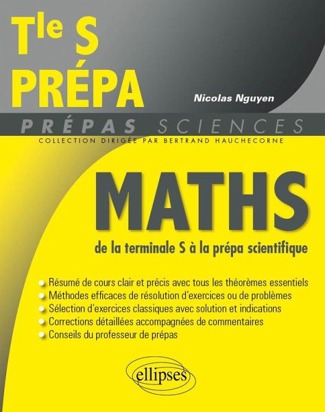 En route pour la Prépa ! Les Maths en vacances ! La rentrée en Prépa est difficile, parfois décourageante : rythme de travail, acquisition des connaissances, abstraction : tout déconcerte le néophyte. Cet ouvrage est là pour aplanir ces difficultés ; il revisite le cours de maths de Première et Terminale S avec l'esprit de l'enseignement supérieur, en sélectionnant les parties les plus utiles pour la suite. Il vous permet : - de rafraîchir vos souvenirs - de combler vos lacunes - d'avoir une vision synthétique et transversale des connaissances - d'acquérir l'exigence de l'enseignement supérieur - d'être tout de suite opérationnel en début de prépa. Chaque chapitre est constitué : - d'un résumé de cours retraçant l'essentiel - de méthodes efficaces de résolution - d'exercices ou de problèmes - d'exercices classiques avec corrections - de conseils du professeur de prépa. Compagnon de vos vacances, ce livre vous permettra d'aborder sereinement la rentrée en Prépa avec de bonnes bases en mathématiques. Indispensable, que vous entriez en Prépas MPSI, PCSI, PTSI, BCPST, BL ou toute filière du supérieur où les mathématiques jouent un rôle important.
