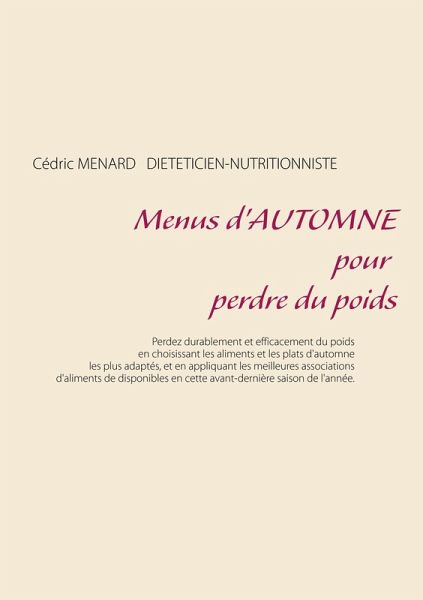 Cet ouvrage est dédié à toutes les personnes souffrant de surpoids ou d'obésité, et il offre aux détenteurs des ouvrages du même auteur : " Apprenez à manger & maigrissez !" et " Recettes et menus pour perdre du poids " un ouvrage parfaitement complémentaire. L'auteur vous propose trois mois de menus spécifiquement adaptés à votre régime alimentaire amaigrissant, tous très simples à mettre en pratique grâce à des plats, des légumes et des fruits d'automne vous étant proposés, vous permettant ainsi de mieux adapter votre alimentation à votre désir de perte de poids. Un ouvrage diététique de référence pour celles et ceux qui souhaitent efficacement et durablement perdre du poids !
