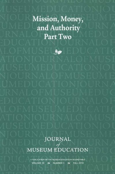 Sponsored by the Museum Education Roundtable, this is volume 35, Number 3 of the Journal of Museum Education (JME) Part Two of Mission, Money, and Authority, published in the fall of 2010. This edition includes articles on insistent questions in our learning age, the museum's economic footprint, putting art into work revenue, when education meets admissions, generating museum education programs for knowledge and three case studies on money and the mission.