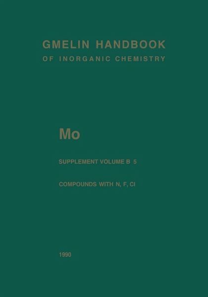 In the first part of this volume the nitrogen-containing compounds of molybdenum are described. The Mo-N system shows that M0 N and MoN are the stable nitrides. MOlybdenum 2 metal dissolves nitrogen to some extent but only at high temperatures. To get better insight into the reactions between nitrogen and molybdenum, the solubility, diffusion, adsorption and desorption phenomena, and ion bombardment are included in the section of the Mo-N system. M0 N has a large range of homogeneity toward lower nitrogen concentrations. The black 2 hexagonal MoN has only a narrow range of homogeneity. In addition some molybdenum compounds containing nitrogen and oxygen are known. The second part contains a full description of the compounds of molybdenum with fluorine. The fluorides MoF n with n ~ 2 are metastable while those with n = 3 to 6 are stable and have been observed in the Mo-F system. Pure MoF can exist without traces of oxygen, in co nt rast 3 to earlier assumptions. MoF was unambigously prepared and characterized in 1957. Its crystal 4 structure is still unknown. MoF is often contaminated with the oxide fluoride MoOF and it is s 4 difficult to remove. Even sm all amounts affect the properties of MoF . MoF , which is liquid at s 6 room temperature and solidifies to a "plastic" crystal modification below ca. 17SC, is the most investigated of all the molybdenum fluorides.