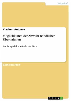 Bachelorarbeit aus dem Jahr 2014 im Fachbereich BWL - Unternehmensführung, Management, Organisation, Note: 1,7, Helmut-Schmidt-Universität - Universität der Bundeswehr Hamburg, Sprache: Deutsch, Abstract: In den letzten drei Jahren ist die Zahl der Übernahmen in Deutschland auf einem konstanten Level geblieben, jedoch hat sich das kumulierte Volumen aller Übernahmen von mehr als 10.000 Mio. EUR deutlich erhöht. Das hohe Volumen und die zukünftig steigende Anzahl von Transaktionen, die mit der Entwicklung der Aktienmärkte korreliert, stellt Unternehmen vor die Problematik des Souveränitätsschutzes. Die Frage, die dabei gestellt werden muss, ist: Welche Möglichkeiten hat ein Unternehmen zur Abwehr von Übernahmen. Das obige Zitat Warren Buffetts bringt zum Ausdruck, wie das Risiko einer Übernahme vermindert werden kann: durch Kenntnis der Abwehrmaßnahmen, die einem Unternehmen zur Verfügung stehen. Die vorliegende Arbeit befasst sich mit diesem Wissen um die Abwehr von feindlichen Übernahmen. Sie ist in zwei Abschnitte gegliedert. Zunächst wird sich der theoretische Teil mit den Motiven einer Übernahme befassen und mit der Frage, welche wichtigen Investorengruppen existieren. Daraufhin werden der Interessenkonflikt wichtiger Stakeholder und die grundsätzlichen Möglichkeiten, ein Unternehmen zu übernehmen, beschrieben. Im Anschluss daran werden die konkreten Abwehrmaßnahmen in den verschiedenen Übernahmephasen dargestellt und in den hier wirksamen rechtlichen Rahmen eingeordnet. Wichtige Punkte für eine optimale Abwehr werden anschließend erläutert. Am Beispiel der Münchener Rückversicherungs- Gesellschaft AG werden dann die Abwehrmaßnahmen beispielhaft auf ein Unternehmen appliziert. Dabei ergeben sich zwei Arten von Maßnahmen: direkte und indirekte. Sie differenzieren sich in Bezug auf die Absicht, ob das Handeln der Abwehr oder anderen unternehmerischen Aspekten dient. Im Fazit wird dann versucht, die Frage nach der einen richtigen Abwehrstrategie zu beantworten.