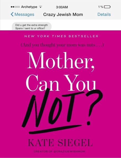 Based on the wildly popular Instagram account @CrazyJewishMom, Kate Siegel's essay collection about life with the woman who redefined the term "helicopter mom." There is nothing more wonderful than a mother's love. There is also nothing more annoying. Who else can proudly insist that you're perfect while simultaneously making you question every career, fashion, and relationship decision you have ever made? No one understands the delicate mother-daughter dynamic better than Kate Siegel-her own mother drove her so crazy that she decided to broadcast their hilarious conversations on Instagram. Soon, hundreds of thousands of people were following their daily text exchanges, eager to see what outrageous thing Kate's mom would do next. Now, in Mother, Can You NOT?, Kate pays tribute to the woman who invented the concept of drone parenting. From embarrassing moments (like crashing Kate's gynecological exams) to outrageous stories (like the time she made Kate steal a cat from the pound) to hilarious celebrations (including but not limited to parties for Kate's menstrual cycles), Mother, Can you NOT? lovingly lampoons the lengths to which our mothers will go to better our lives (even if it feels like they're ruining them in the process).