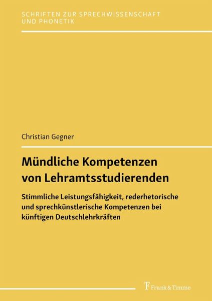 Die mündliche Kommunikation ist im Deutschunterricht zentral. Mit den Bildungsstandards für den Kompetenzbereich 'Sprechen und Zuhören' hat die Kultusministerkonferenz festgelegt, was Schülerinnen und Schüler im Bereich 'Mündliche Kommunikation' können sollen. Sie stellt zugleich klare Anforderungen an die Eigenkompetenzen von Lehrkräften. Wie es in der Praxis um die stimmliche Leistungsfähigkeit, die rederhetorischen Kompetenzen und die Fähigkeit zum Textgestalten bei Nachwuchslehrkräften bestellt ist, zeigt Christian Gegner. Aufschlussreich sind insbesondere seine Erkenntnisse zur Genese dieser Kompetenzen im Verlauf des Studiums sowie zu den Auswirkungen der stimmlichen Leistungsfähigkeit auf die rederhetorischen und sprechkünstlerischen Fähigkeiten der Studierenden. Christian Gegner ist nach dem Studium der Germanistik, Geschichte, Sozialpsychologie sowie der Mündlichen Kommunikation und Sprecherziehung seit 2009 Lehrkraft für Sprecherziehung und seit 2015 Geschäftsführer am Zentrum für Sprache und Kommunikation der Universität Regensburg. Die Stimme von Lehrkräften sowie die Rede- und Gesprächsrhetorik sind Schwerpunkte seiner Forschungs- und Lehrtätigkeit. Seit 2010 ist er 1. Vorsitzender der Berufsvereinigung Sprechkompetenzen in Bayern e. V.