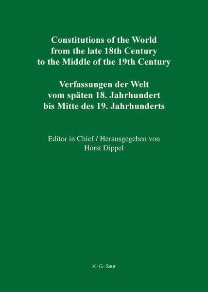 Die Buchedition Verfassungen der Welt vom späten 18. Jahrhundert bis zur Mitte des 19. Jahrhunderts ist die vollständigste und wissenschaftlich fundierteste Sammlung ihrer Art. Sie enthält Verfassungsdokumente, die weltweit ab 1776 bis zum Ende des Jahres 1849 verfasst und verbreitet worden sind. Rund 1.600 Verfassungen, Verfassungsänderungen, Menschenrechtserklärungen sowie Entwürfe von Verfassungen, die niemals in Kraft getreten sind, sind aus diesem Zeitraum überliefert. Diese frühen Verfassungsdokumente sind im Rahmen eines Projekts der Deutschen Forschungsgemeinschaft in Archiven und Bibliotheken der ganzen Welt gesichtet und gesammelt worden. Auf Grundlage der Originaldokumente rekonstruierten Experten amerikanischer sowie europäischer Universitäten jeweils für ein Land die authentischen Verfassungstexte und annotierten diese in der jeweiligen Amtssprache. Jeder Band enthält eine kurze Einführung, einen Hauptteil mit den edierten Verfassungsdokumenten eines Landes, Anmerkungen und einen Index. Der einzigartige Wert dieser Gesamtedition liegt darin, dass hier erstmals sämtliche, bislang weit verstreute und vielfach unbekannte Verfassungen aus der Frühphase des modernen Konstitutionalismus auf zuverlässiger, authentischer Textbasis verfügbar gemacht werden. Insgesamt werden die Verfassungen von rund 50 Ländern Europas, Nord- und Südamerikas bandweise, Land für Land veröffentlicht. Verfassungen der Welt vom späten 18. Jahrhundert bis Mitte des 19. Jahrhunderts ist eine einmalige und grundlegende Quellenedition und eine umfassende Dokumentation der Verfassungsgeschichte. Gleichtzeitig ergänzt sie die Mikrofiche-Edition Verfassungen der Welt 1850 bis zur Gegenwart. Der Herausgeber, Horst Dippel, ist Professor für Britische und Nordamerikanische Geschichte an der Universität Kassel.