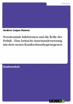 Studienarbeit aus dem Jahr 2011 im Fachbereich Gesundheit - Sonstiges, Hochschule Bremen, Sprache: Deutsch, Abstract: Nach Schätzungen einer Studie des Instituts für Umweltmedizin und Hygiene der Charite - Universitätsmedizin in Berlin aus dem Jahr 2008, auf die sich auch das Bundesgesundheitsministerium beruft, treten pro Jahr etwa 400 000 bis 600 000 nosokomiale Infektionen in Deutschland auf, die bei etwa 10 000 bis 15 000 Patienten tödlich verlaufen, wobei davon ausgegangen wird, dass 20 bis 30 % der gesamten Fälle vermeidbar sind (vgl. Gastmeier & Geffers 2008). Die Deutsche Gesellschaft für Krankenhaushygiene geht sogar davon aus, dass mindestens 700 000 Menschen jedes Jahr nosokomiale Infektionen in Deutschland erwerben und mit 30000 Toten jährlich gerechnet werden muss (vgl. Exner et al. 2011). Immer wieder erschüttern Berichte über Zwischenfälle in Krankenhäusern die Öffentlichkeit, doch stellt sich immer wieder die Frage was getan werden muss, um das Problem der nosokomialen Infektionen in den Griff zu bekommen und inwieweit die Politik durch rechtliche Regelungen eingreifen muss und sollte. In dieser Arbeit soll es um eine kritische Auseinandersetzung mit den wesentlichen Punkten des neuen Gesetzes gehen, sowie dem Diskurs in der Politik und dem zwischen ihr und der Praxis. Auch soll der Frage nachgegangen werden, ob es überhaupt alleinige Aufgabe der Politik sein kann und muss die Hygiene in medizinischen Einrichtungen zu verbessern.