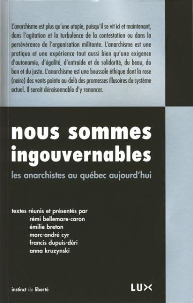 Peut-etre ne le savez-vous pas, mais les anarchistes sont tres actifs au Quebec soutenait un chroniqueur du Journal de Montreal, au cours de la grande greve etudiante de 2012. Au-dela d'un phenomene spectaculaire associe au chaos, quelle est la veritable nature des activites de la nebuleuse anarchiste Et surtout, qui de mieux que des anarchistes pour l'expliquer Nous sommes ingouvernables constitue une reponse a plusieurs voix par des anarchistes qui militent dans divers reseaux. Cette mosaique forme un portrait ouvert de ce qui fait le cA ur et le corps du mouvement -anarchiste aujourd'hui au Quebec.