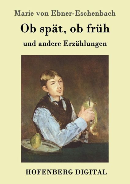 Marie von Ebner-Eschenbach: Ob spät, ob früh und andere Erzählungen Inhaltsverzeichnis Ob spät, ob früh Erste Trennung In letzter Stunde Das tägliche Leben Susannens Weihnachtsabend Biographie Vollständige Neuausgabe mit einer Biographie der Autorin. Herausgegeben von Karl-Maria Guth. Berlin 2015. Umschlaggestaltung von Thomas Schultz-Overhage unter Verwendung des Bildes: Édouard Manet, Birnenschäler, 1868. Gesetzt aus Minion Pro, 11 pt. Über die Autorin: 1830 als Freiin von Dubsky auf Schloß Zdislavic bei Kremsier in Mähren geboren, genießt Marie eine klassische geistige Bildung, bereits mit siebzehn unternimmt sie erste literarische Versuche. Nach der Heirat mit ihrem Vetter Moritz Freiherr von Ebner-Eschenbach lebt sie bis 1856 in Klosterbruck in Mähren, danach bis zu ihrem Lebensende in Wien, wo sie 1879 eine Ausbildung als Uhrmacherin absolviert. Nach erfolglosen dramatischen Versuchen, veröffentlicht sie 1876 - ermutigt von Franz Grillparzer - den heute als eines ihrer Hauptwerke bekannten Roman über die Magd »Bozena«, der jedoch zunächst nur zögerlich Anerkennung findet. Ihren Durchbruch erreicht sie 1880 mit »Lotti, die Uhrmacherin«, der die größeren Erzählungen »Das Gemeindekind« und »Unsühnbar«, sowie die »Dorf- und Schloßgeschichten« (darin u.a. »Krambambuli«) folgen. Humanitär gesinnt schildert sie Adel wie Kleinbürgertum in so scharfsinniger wie kritischer Detailtreue. Marie von Ebner-Eschenbach ist als bedeutende Vertreterin des kritischen Realismus eine der großen Autorinnen des 19. Jahrhunderts. Von der Universität Wien zum Ehrendoktor der Philosopie ernannt und als erste Frau überhaupt mit dem Ehrenzeichen für Kunst und Wissenschaft ausgezeichnet, stirbt sie am 12. März 1916 im Alter von 85 Jahren in Wien.