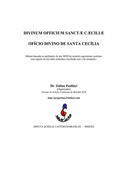 Minuta baseada no antifonário do ano MXII do mosteiro agostiniano austríaco com suporte do breviário tridentino conciliado com o do monástico. Ao elaborarmos a Antologia musical à Santa Cecília, deparamo-nos com o tesouro contido no antifonário agostiniano austríaco, cujo jubileu milenar nos estimulou a editar suas músicas destinadas à Santa Cecília no intuito de difundir melhor este precioso repertório. Com edição concluída, restauramos este Ofício Divino de Santa Cecília para uso atual. Em respeito ao manuscrito medieval, cujo fac-símile encontra-se aqui anexado para fácil consulta, preferimos reconstruir o ofício agostiniano por meio do breviário tridentino de 1570. Incluíram-se todas as músicas e orações necessárias à estrutura do ofício, muitas encontradas em fontes contemporâneas. Schola Cantorum de Brasília SCB foi fundado por Dr. Zoltan Paulinyi em 2012 como seção de oração cantada da Escola de Música Paulinyi. Atualmente sediado em Brasília Asa Norte, oferece cursos de violino, piano, fagote, composição e análise musical, canto gregoriano, lecionando desde iniciantes até pós-graduandos, presencialmente e à distância. Inscrições estão abertas continuamente durante o ano inteiro pelo telefone +55.61.986534811. Informações em gregoriano.Paulinyi.com Prof. Zoltan Paulinyi é doutor em música pela Universidade de Évora 2013. Violinista da Orquestra Sinfônica do Teatro Nacional Claudio Santoro OSTNCS desde o ano 2000, leciona internacionalmente desde 1995.
