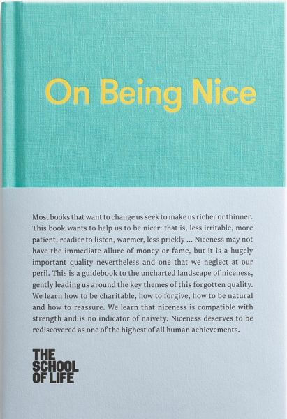 A practical guide to being nice. Much of today's media tells us to be thinner, richer, and more successful. This book tells us how to be nicer. Niceness may not have the immediate allure of money or fame, but we can all benefit from practical advice on how to be more patient, better at listening, less irritable, and less defensive. This is a guidebook to the uncharted landscape of niceness, gently exploring the key themes of this often overlooked quality. We learn how to be charitable, how to forgive, how to be natural, and how to reassure. We learn that, rather than indicating naivety, kindness and empathy are in fact unique strengths-and deserve to be rediscovered as the greatest of all human achievements.