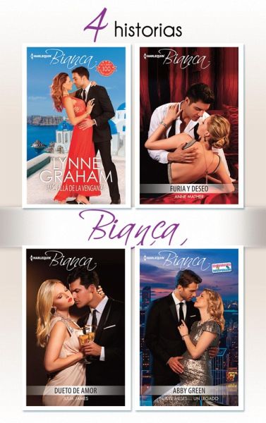Más allá de la venganza Lynne Graham Comprada para venganza del griego. A pesar de no tener ni el dinero ni los contactos necesarios, Prunella Palmer había despertado el interés del archienemigo de Nikolai Drakos. Hacerla suya sería la mayor satisfacción para Nikolai. El despiadado magnate estaba dispuesto a utilizar los medios que fueran necesarios para asegurarse la atención de Prunella, de modo que adquirió las deudas de su familia. Unas deudas que perdonaría si ella se convertía en su amante. Cuando descubrió su inocencia, Nikolai se vio obligado a reconsiderar su decisión y tomarla como esposa. Furia y deseo Anne Mather Una aventura prohibida, ¿para siempre? Cinco años antes, Abby habría dado cualquier cosa por ser la amante de Luke Morelli. El sabor de su boca y el calor de sus caricias le ofrecían un refugio. Pero el amor de Luke quedaba fuera de su alcance porque ella estaba casada con otro hombre... Ahora Luke había vuelto. Eso sí, sin haber olvidado la traición de Abby, y decidido a hacerle pagar caras sus mentiras. Libre por fin de su marido, solo había un modo de hacer las paces. Una aventura habría sido imposible entre ellos tiempo atrás, pero ahora Abby estaba disponible y podía hacerla suya. Dueto de amor Julia James Una seducción sin remordimientos... A Bastiaan Karavalas le encantaba la emoción de la caza. En aquella ocasión, su presa era la tentadora Sarah Fareham. Desgraciadamente, aquella seducción no sería solo por placer. Ella representaba una amenaza para su familia y debía ocuparse de ella. Sarah soñaba con convertirse en cantante de ópera, pero tenía que ganarse la vida como artista de un club nocturno, superando sus inhibiciones y ocultándose bajo el sensual personaje que representaba en el escenario, Sabine Sablon. Sabine se convirtió en su única defensa contra el sugerente acoso al que la sometía Bastiaan... Nueve meses... un legado Abby Green Una noche de pasión alteró sus vidas... Desesperada por salvar a su padre, la empleada de hogar Rose O'Malley creyó que podría atrapar a un hombre. Pero, en cuanto vio a Zac Valenti y percibió la fuerza de su sensualidad, supo que no sería capaz. Antes de que pudiera volverse atrás, el soltero más codiciado de Manhattan la sedujo y la llevó a la cama. Rose se escabulló por la noche, como una cenicienta culpable, y se prometió no volver a ver a Zac... Hasta que descubrió que estaba embarazada y que Zac exigía que ella y su bebé estuvieran bajo su control.