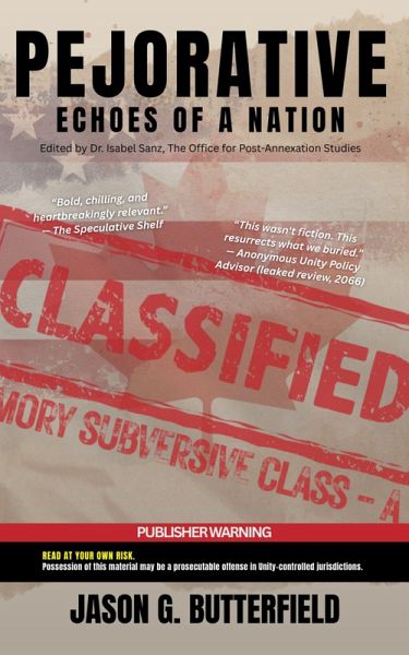 Pejorative: Echoes of a Nation is a hauntingly plausible speculative novel told through a fractured archive of testimonies, smuggled documents, corrupted broadcasts, and the reflections of a vanished resistance archivist. Set in a near-future Canada quietly annexed under the banner of continental "unity," the story unfolds through recovered files curated by the last person who tried to remember out loudJason Butterfield.