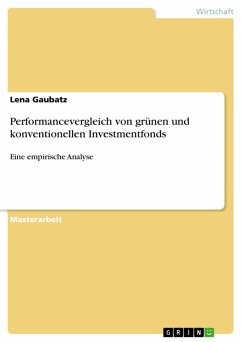 Masterarbeit aus dem Jahr 2020 im Fachbereich BWL - Bank, Börse, Versicherung, Note: 1,7, Universität Duisburg-Essen (Fakultät für Betriebswirtschaft), Sprache: Deutsch, Abstract: Das Forschungsziel dieser Arbeit ist es, mittels eines statistischen Performancevergleichs von grünen und konventionellen Investmentfonds im Hinblick auf Risiko- und Renditekennzahlen diese Frage zu beantworten. Hierbei werden diverse historische Ereignisse, die im Zusammenhang mit der globalen Klima- und Umweltkrise stehen, sowie Klimaratings berücksichtigt. Das erste Kapitel dieser Arbeit umfasst die theoretischen Grundlagen grüner Investmentfonds. Im Zuge dessen werden die Begriffe "nachhaltig" und "grün" im Kontext von Geldanlagen definiert sowie Möglichkeiten und die historische Entwicklung grüner Geldanlagen in Deutschland dargestellt. Im Anschluss findet eine genauere Betrachtung von Investmentfonds statt. Darunter fallen ihre allgemeine Funktionsweise, ihre Differenzierungsmerkmale nach dem Kapitalanlagegesetzbuch (KAGB) und Fondstypen. Zuletzt werden Besonderheiten von grünen Investmentfonds in Bezug auf ihre Anlagestrategie und Qualitätsmerkmale dargelegt. Im zweiten Kapitel erfolgt die Vorstellung der Performancemessung aus theoretischer Sicht, welche neben ihren Grundlagen, wie die Zielsetzung und Komponenten für die Messung von Investmentfonds, internationale Richtlinien umfasst. Zunächst werden relevante Untersuchungen aus theoretischer und empirischer Sicht vorgestellt. Hierbei werden die Ansätze der Portfoliotheorie von Markowitz und die Stakeholder-Theorie erläutert. Darauf folgt ein Überblick über relevante empirische Studien zur Performancemessung nachhaltiger und grüner Investmentfonds und eine anschließende Hypothesenableitung. Zu Beginn des dritten Kapitels werden die der Performanceanalyse zugrundeliegende Datenbasis, Parameter und Bewertungszeiträume beschrieben. Daneben wird das für die Analyse verwendete statistische Verfahren dargelegt. Im Folgenden werden die Ergebnisse der Analyse berichtet und die entsprechenden Hypothesen überprüft. Zum Schluss findet eine kritische Würdigung der Untersuchungsergebnisse statt, wobei die kritische Reflexion der eigenen Performanceanalyse und Untersuchungsergebnisse vor dem Hintergrund der Literatur erfolgt und Handlungsempfehlungen an die Politik und Investoren ausgesprochen werden.