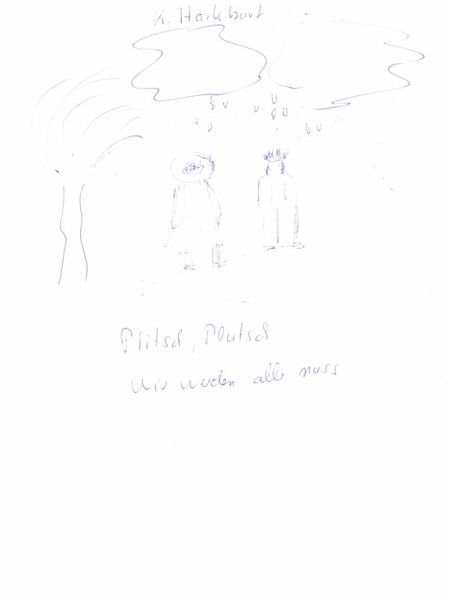 Petra, Markus und Jonas spielen draußen, als sich ein Gewitter ankündigt. Eigentlich wollten sie noch auf den Spielplatz oder in den Park, aber als das Unwetter kommt, bekommt Jonas Angst. Petra versucht sie zu beruhigen, aber dann bricht das Unwetter los. Sie bleiben zu Hause und finden den Regen und die Pfützen ganz toll.
